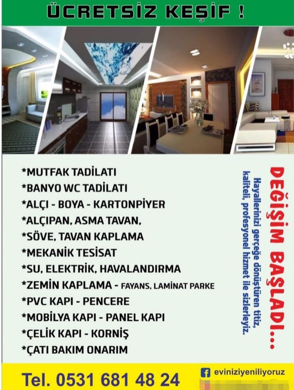Uzman Kadromuz ile A dan Z ye Anahtar Teslim ev tadilatı yapmaktayız.Mutfak,Banyo Tadilatı boya badana zemin kaplama parke fayans vs çelik kapı mobilya kapılar ….